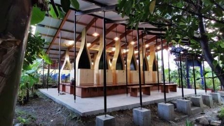 这座图书馆由台基、结构及屋顶3个部分组成,没有外墙,是一个开放式的建筑空间。因为冠病疫情原因,图书馆是以预造方式建造,前期在大学工作室将部分构造先准备好,完成后再运到现场,以最快的方式组建起来。